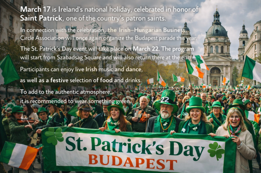 March 17 is Ireland’s national holiday, celebrated in honor of Saint Patrick, one of the country’s patron saints. In connection with the celebration, the Irish–Hungarian Business Circle Association will once again organize the Budapest parade this year. The St. Patrick’s Day event will take p...